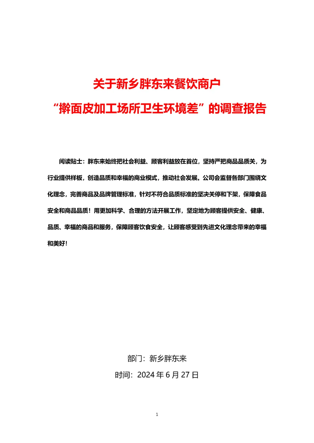 6月27日凌晨,“胖东来商贸集团”官方公号发布《关于新乡胖东来餐饮商户“擀面皮加工场所卫生环境差”的调查报告》,对于帮助其发现了重大食品安全隐患的顾客,给予该顾客10万元现金奖励;对所有于2024年6月9日至2024年6月19日期间在新乡胖东来两店餐饮部购买擀面皮、香辣面的顾客办理退款,给予1000元补偿(共计8833份)。并对胖东来相关工作人员予以辞退、免职、取消年终福利。要求新乡胖东来擀面皮商户即日起停止营业,并解除合同终止合作,限期撤柜。
