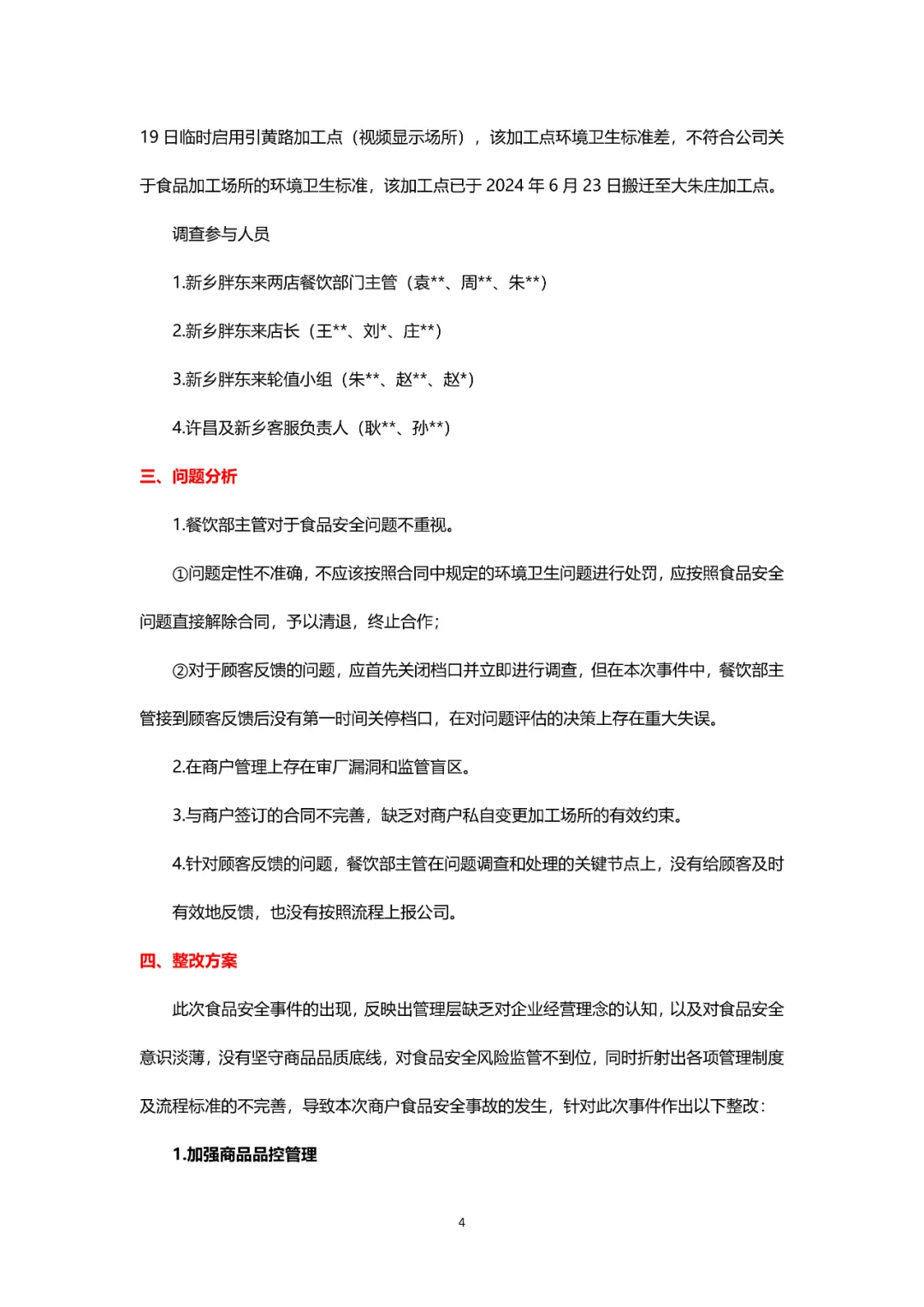 ①新乡餐饮部第一主管(周**)和品控员(李**)在工作中存在严重失职,对本事件负直接责任,依据公司制度决定对以上两位人员予以辞退 ,其他班长以上管理层全部予以免职 ;