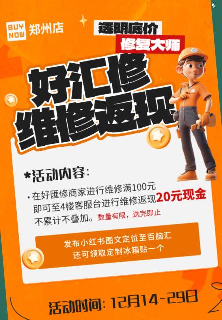 活动期间,在好匯修进行维修/数据恢复满100元即可至客服台进行维修返现,返现金额为20元,不累计不叠加。活动期间发布小红书图文定位至百脑汇还可领取定制冰箱贴一个