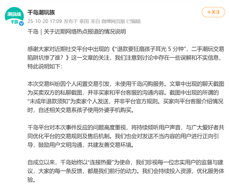 10月20日,@千岛潮玩族 发布关于近期网络热点报道的情况说明:感谢大家对近期社交平台中出现的《“退款要狂扇孩子耳光5分钟”,二手潮玩交易陷阱坑惨了谁?》这一文章的关注,我们注意到讨论中存在一些误解和不实信息,特此说明如下:本次交易纠纷因个人闲置交易引发,未使用千岛闪购服务。文章中出现的聊天截图为买卖双方的私聊截图,并非买家和平台客服的沟通内容。截图中出现的所谓的“未成年退款须知”为卖家个人发送,并非平台官方规则。买家向平台客服介绍情况时,自述相关交易系孩子使用外婆手机购买。